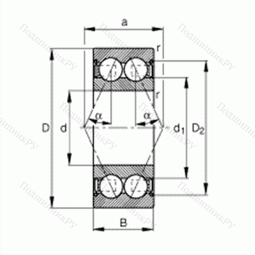 двухрядный, щелевые уплотнения с двух сторон, угол контакта α = 25°