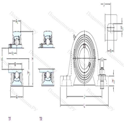 Подшипниковый узел шариковый радиальный SYJ 1. TF представляют собой конструкцию, в которую входит подшипник и подшипниковый корпус (изготавливается из стали, чугуна или других специализированных материалов), состоящий из пары и более составных деталей, привинченных к посадочной поверхности при помощи болтов. Подшипниковая часть включает в себя одну и более составляющие, закрепленные специальной втулкой или установленные прямо на ось. Для подачи смазки в обслуживаемых моделях корпус оборудован отверстиями и смазочной системой. От сора, пыли, грязи и химикатов устройство защищено уплотнителями. Чаще всего встречаются фланцевые, разъемные, цельные и натяжные системы.