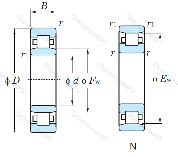 В зависимости от модификации подшипник имеет различную конструкцию: тип N рассмотрен выше, NJ – имеет уширенное внутреннее кольцо, NU – уширенное внешнее;