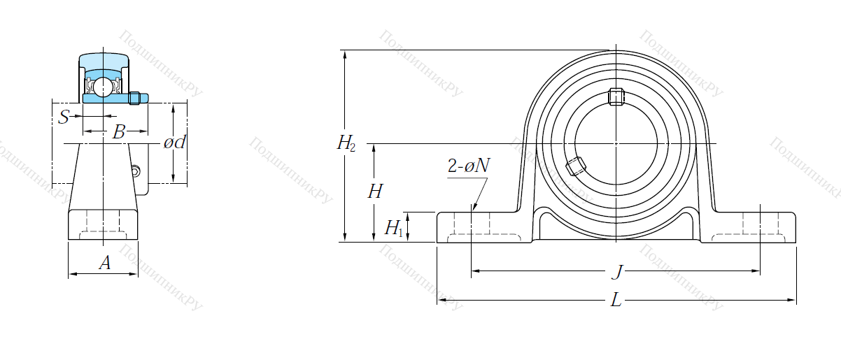 В конструкцию детали входит корпусный подшипник типа UC, установленный в корпус типа Р из чугуна с нишей сферической формы. Монтаж на вал осуществляется посредству кольца, оснащенного парой штифтов, закручиваемых шестигранником, что обеспечивает самовыравнивание.
